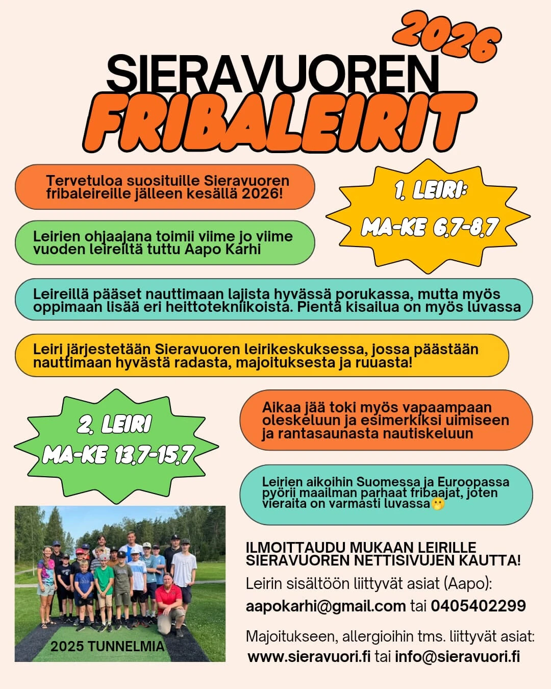 Sieravuori järjestää taas kesällä 2026 suositut kesäleirit 10 - 16 - vuotiaille harrastajille jotka haluavat parantaa peliään ammattilaisten ohjauksessa. Pääkouluttajana viimevuotiseen tapaan Aapo Karhi. Leiri sisältää täysihoidon, 4 x 2-3 treeniä ja radalla pelaamista ohjaajien kanssa sekä muuta leiriohjelmaa. Leirin hinta 259,00, ja ilman majoitusta 199,00. Kullekin leirille otetaan max 40 osallistujaa. Majoitus 2-3 hengen mökeissä ja/tai Sieravuoren Päärakennuksessa yhdessä ohjaajien kanssa.